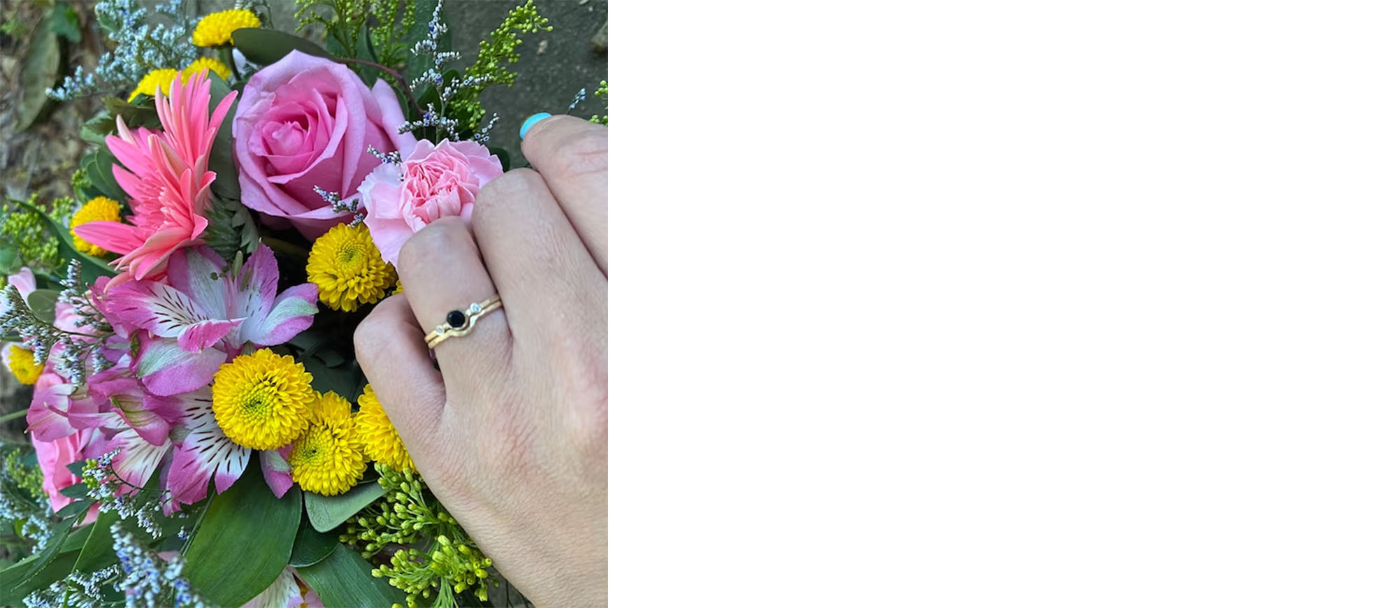 "Absolutely gorgeous, great quality. We got it in yellow gold with matte hammered finish, blue center and white accent stones. Also ordered the marching band. They are dainty and elegant, and exactly what I wanted!" Bella