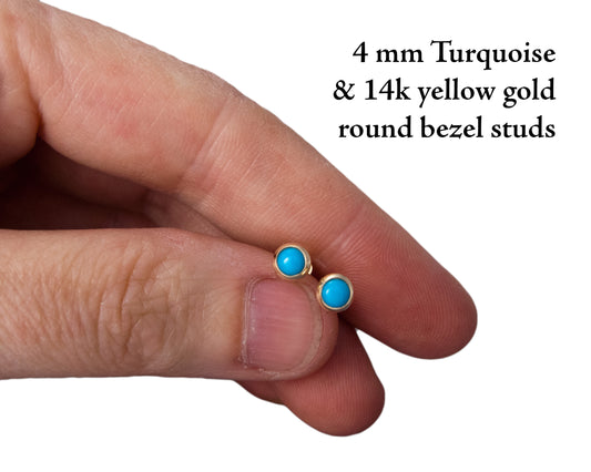 Small Turquoise 14k Gold Studs - 4mm round cabochon bezel earrings