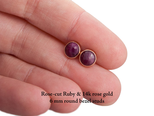 Ruby and Rose Gold Studs - 6mm Rubies in solid 14k rose gold bezels, posts and backs - Ready to Ship