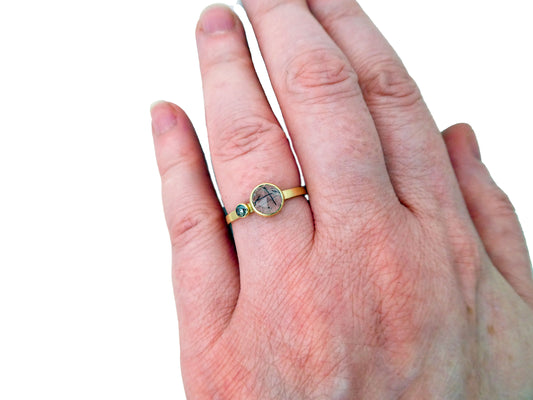 Black Tourmaline in Quartz 14k Yellow Gold Ring, accented with salt and pepper rose cut diamond, size 7