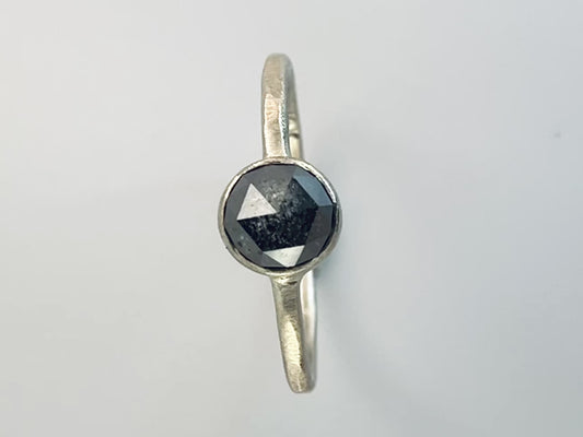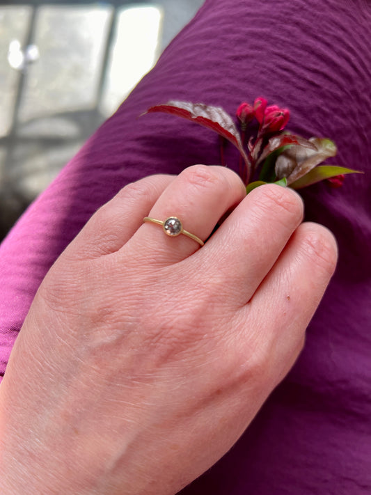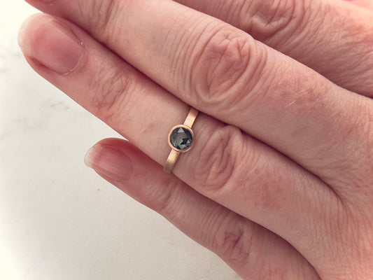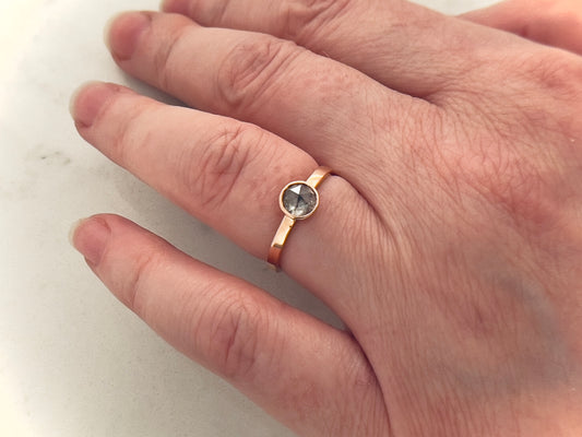 Salt and Pepper Diamond Solitaire Engagement Ring, Round 0.66ct micro-faceted Rose Cut diamond with a low bezel and delicate band in matte 14k yellow gold, size 7.25