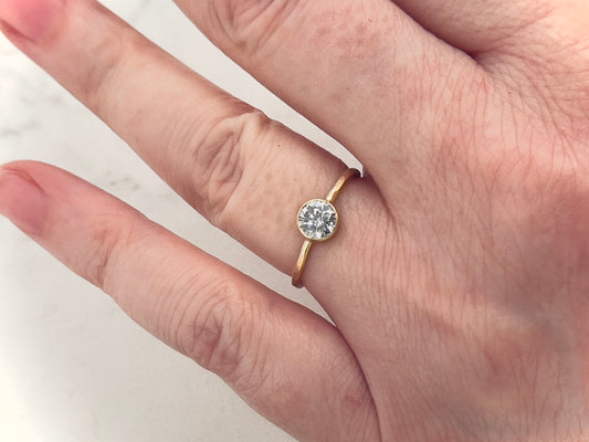 Half Carat Salt and Pepper Diamond Solitaire Engagement Ring, round brilliant cut 0.54ct diamond in a straight sided bezel and delicate 1.25mm round band in matte hammered 18k yellow gold, size 6.75