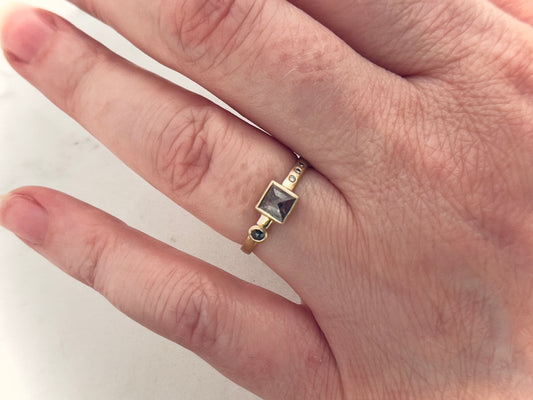 Square Salt and Pepper Black Diamond Engagement Ring with a low bezel and accented with rose-cut and flush-set diamonds
