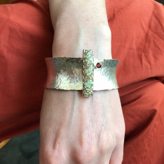 Hubei Turquoise and Garnet Statement Cuff Bracelet in Hammered Sterling Silver