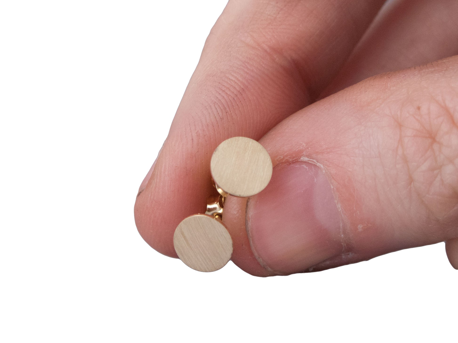 Handmade from 14k gold, these quarter inch disk stud earrings have a classic appeal. With a matte finish and crisp, polished edges, they exude a soft and modern look. Choose from three different gold colors.