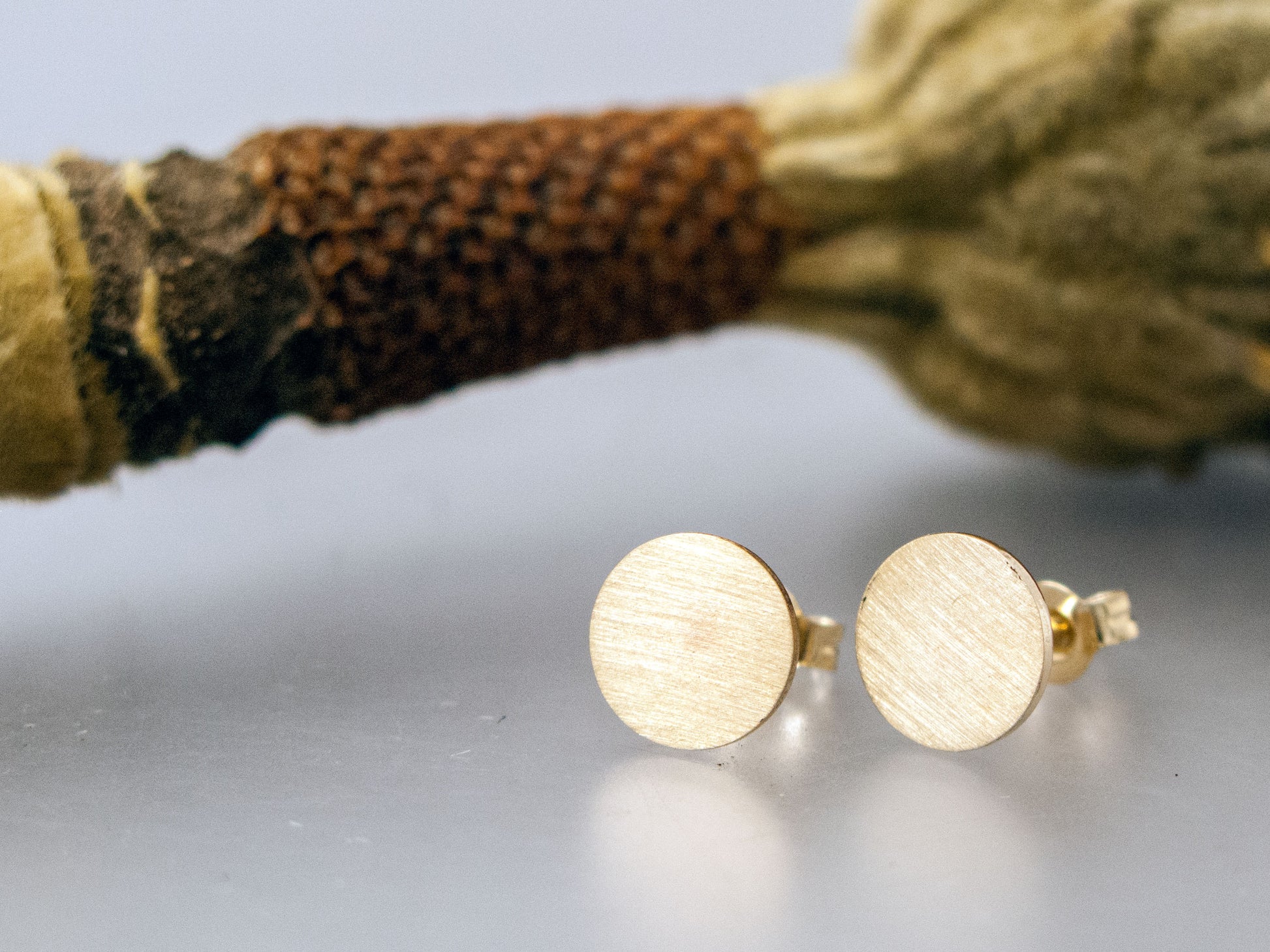 The gold disks are cut from 14k gold sheet that has been recycled in-house. Soldered to 14k posts with 14k backs clutch included.