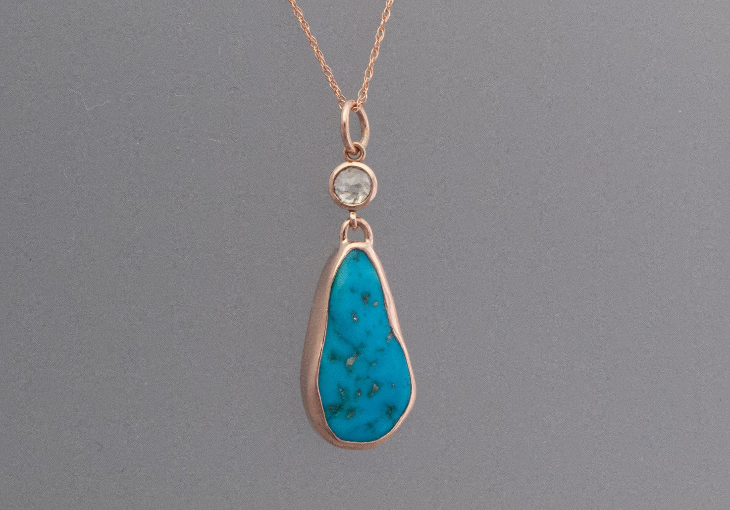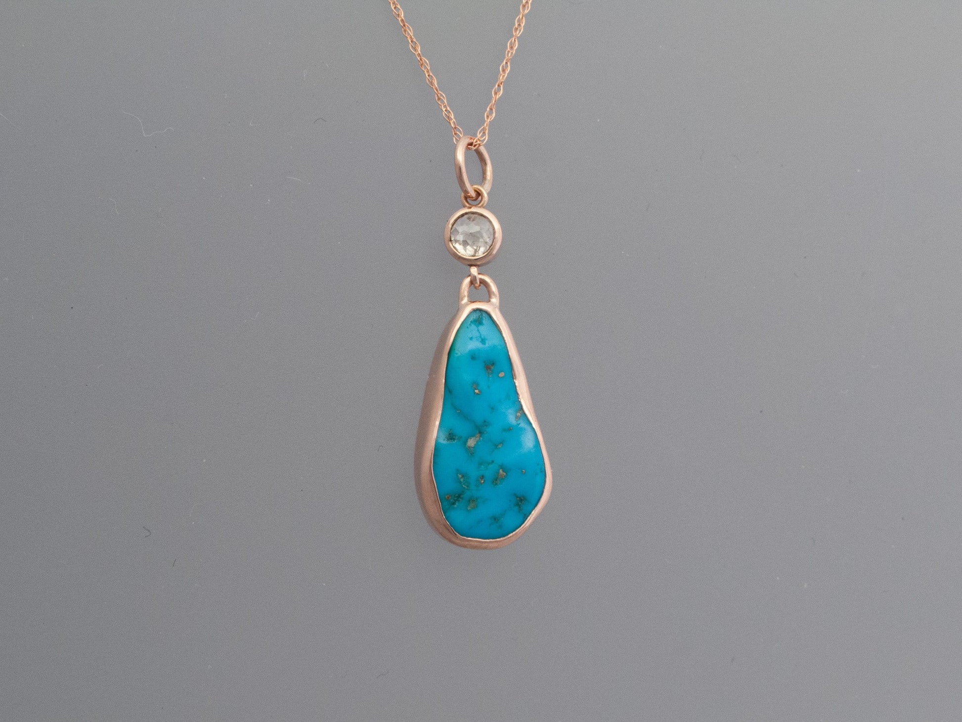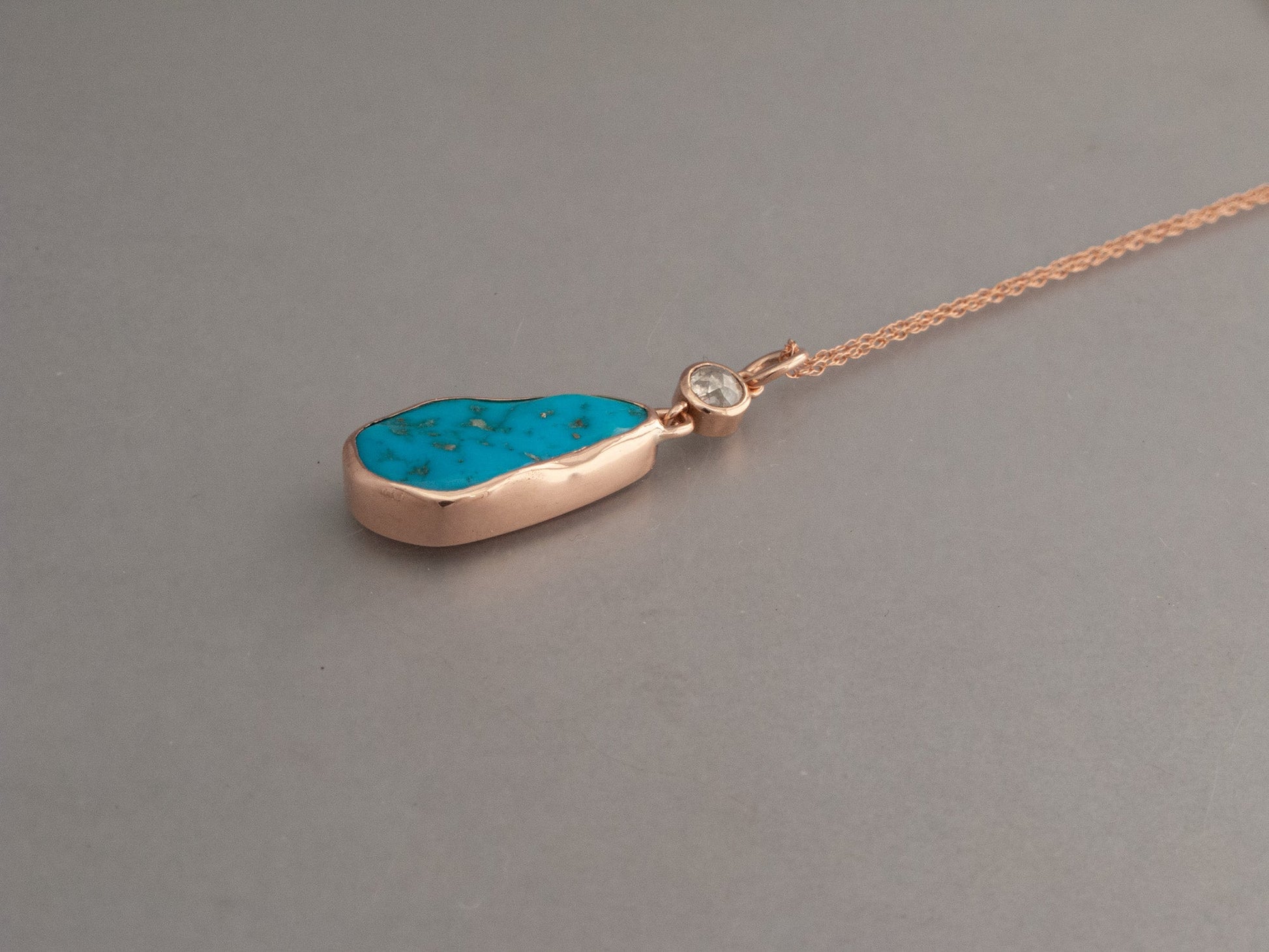 Kingman Turquoise and Rose Cut Diamond Necklace in 14k Rose Gold