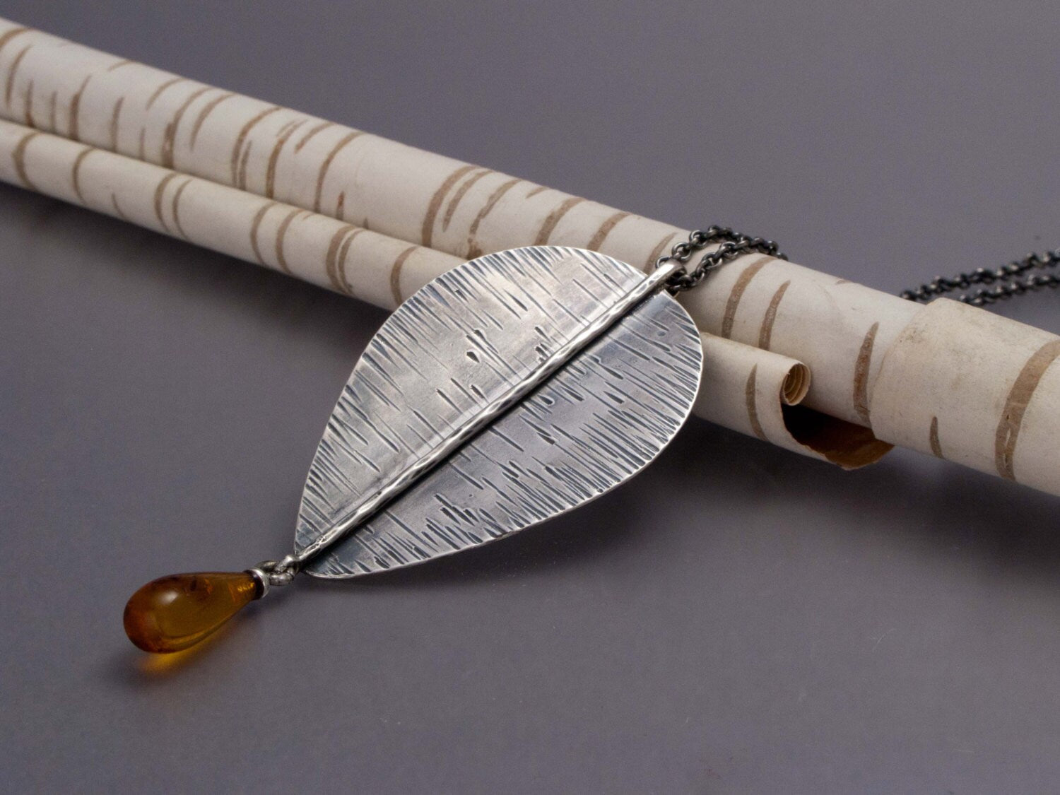 Large Sterling Silver Leaf Pendant Necklace with Amber Drop Ready to Ship
