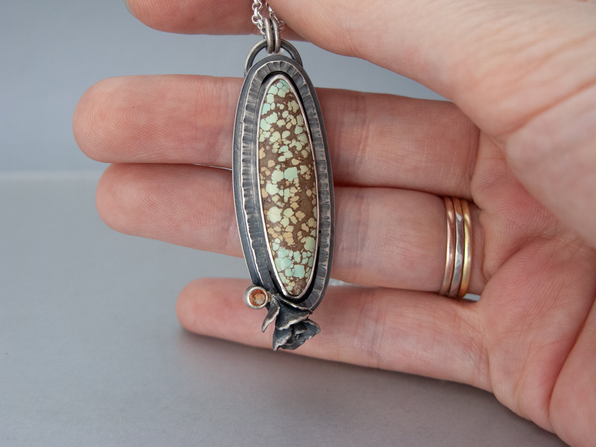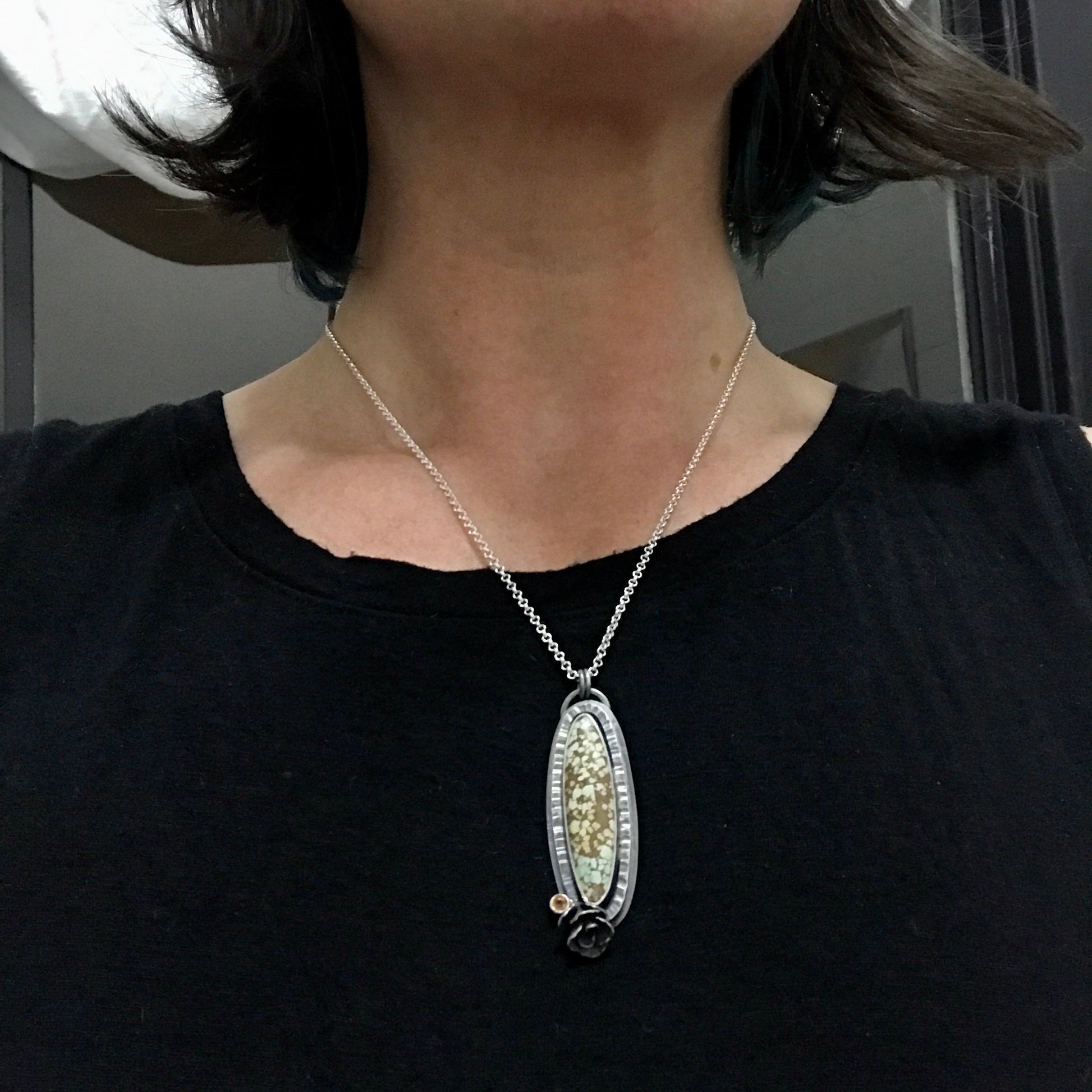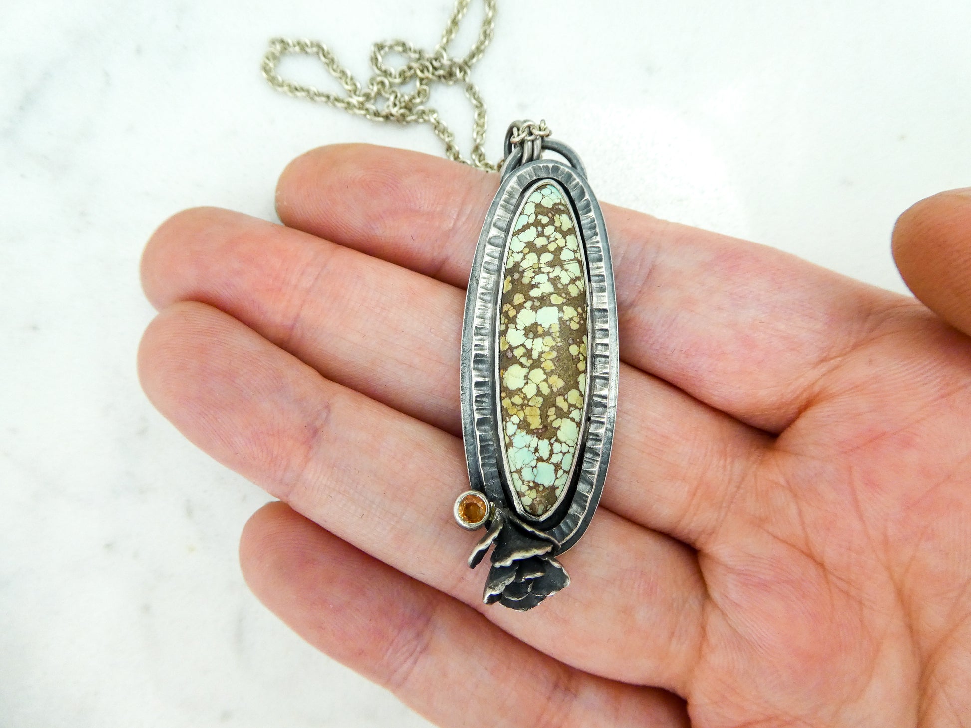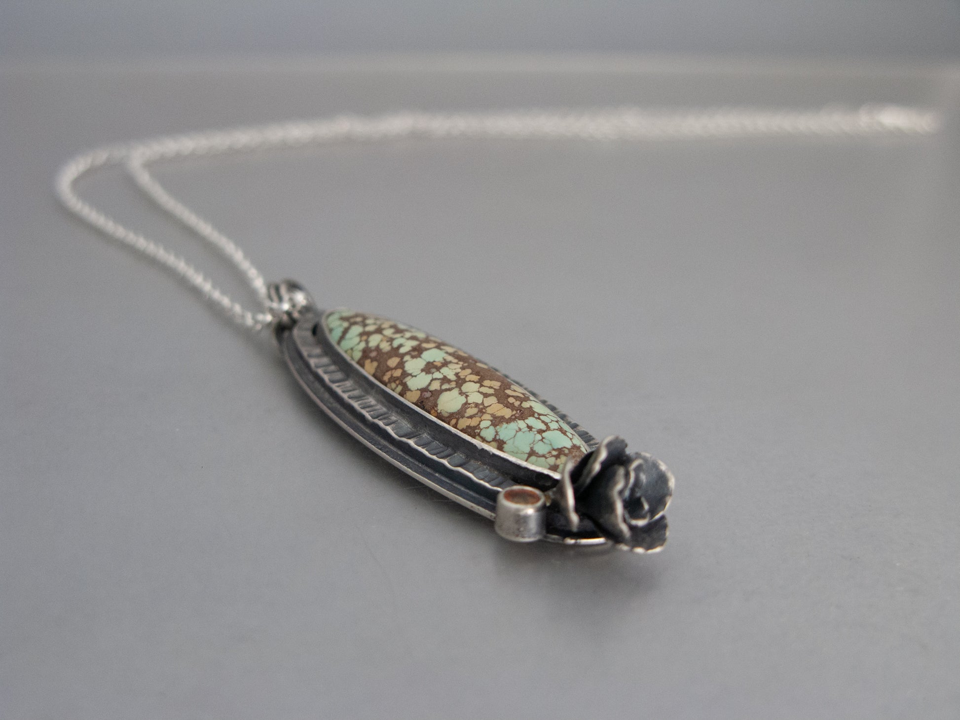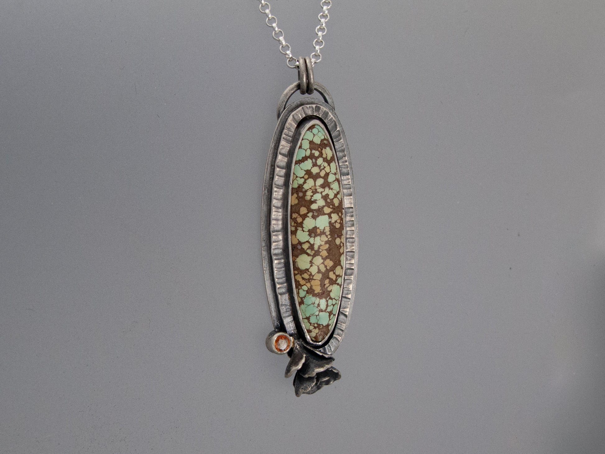 This long oval turquoise pendant is accented with a golden sapphire and hand cast live succulent. An 18 inch sterling silver chain is included.